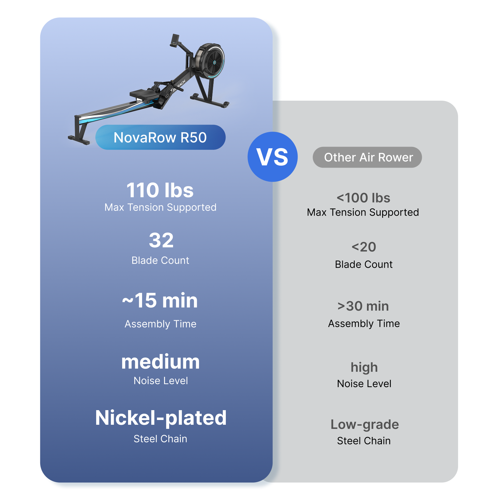Meet the NovaRow R50 — your ultimate full-body, low-impact rower. Engineered for smooth, dynamic air resistance that rivals top brands at half the price. In just 20 minutes, you’ll engage over 86% of your muscles for a powerful, studio-quality workout right at home.