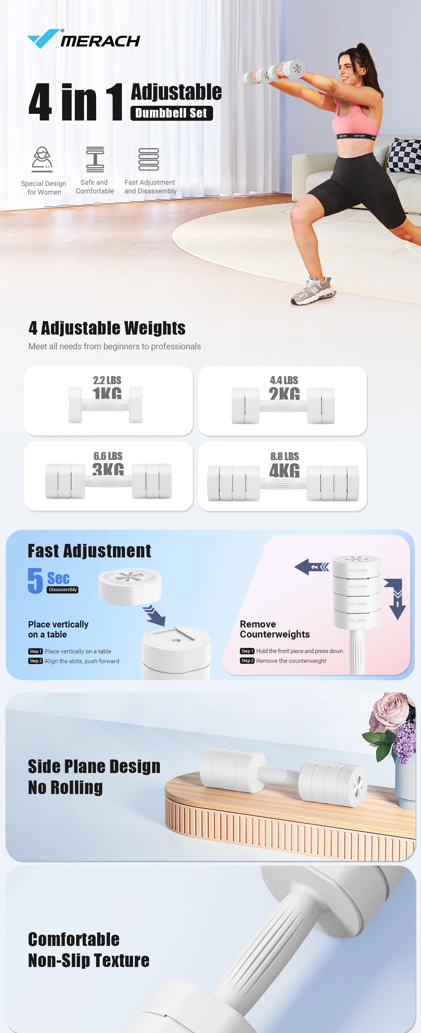 MERACH dumbbell set, individual can be quickly switched and adjusted in 4 weights: each 2.2lbs, 4.4lbs, 6.6lbs, 8.8lbs (pair of 4.4lbs/2kg, 8.8lbs/4kg, 13.2lbs/6kg, 17.6lbs/8kg). Whether for beginner or high intensity strength training, this adjustable dumbbell set will work well with the intensity of your workout.
