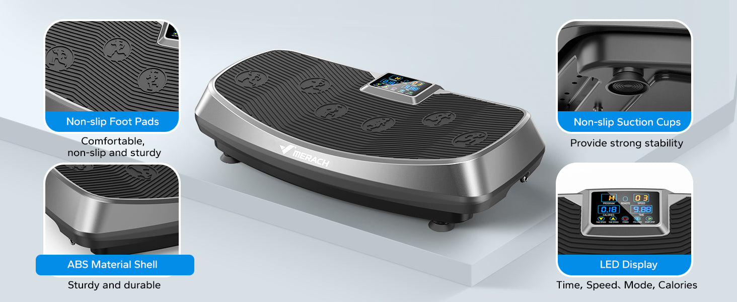 MERACH vibration plate is equipped with two resistance bands, LED touch screen, comfortable footpad, and non-slip suction cups. The resistance bands provide additional muscle engagement, while the LED screen allows for easy monitoring and adjustment of your workout. The comfortable footpad ensures a stable and enjoyable experience, and the non-slip suction cups keep the machine securely in place. Perfect for a comprehensive and effective fitness routine.