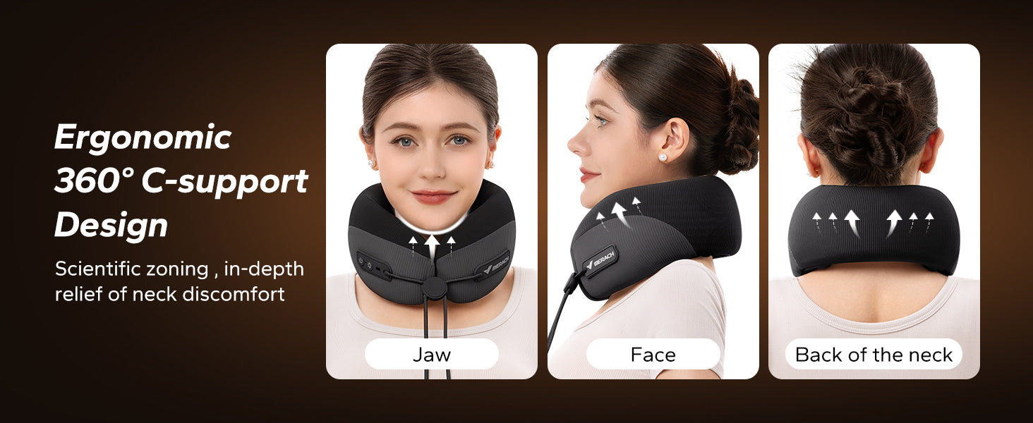 This massage neck pillow is crafted with high-quality fabric and soft memory foam that ensures durability and comfort. The C-shaped design of this massage neck pillow provides full 360° support, preventing your head from tilting and keeping your neck aligned. Ideal for planes, cars, trains, or even home lounging.