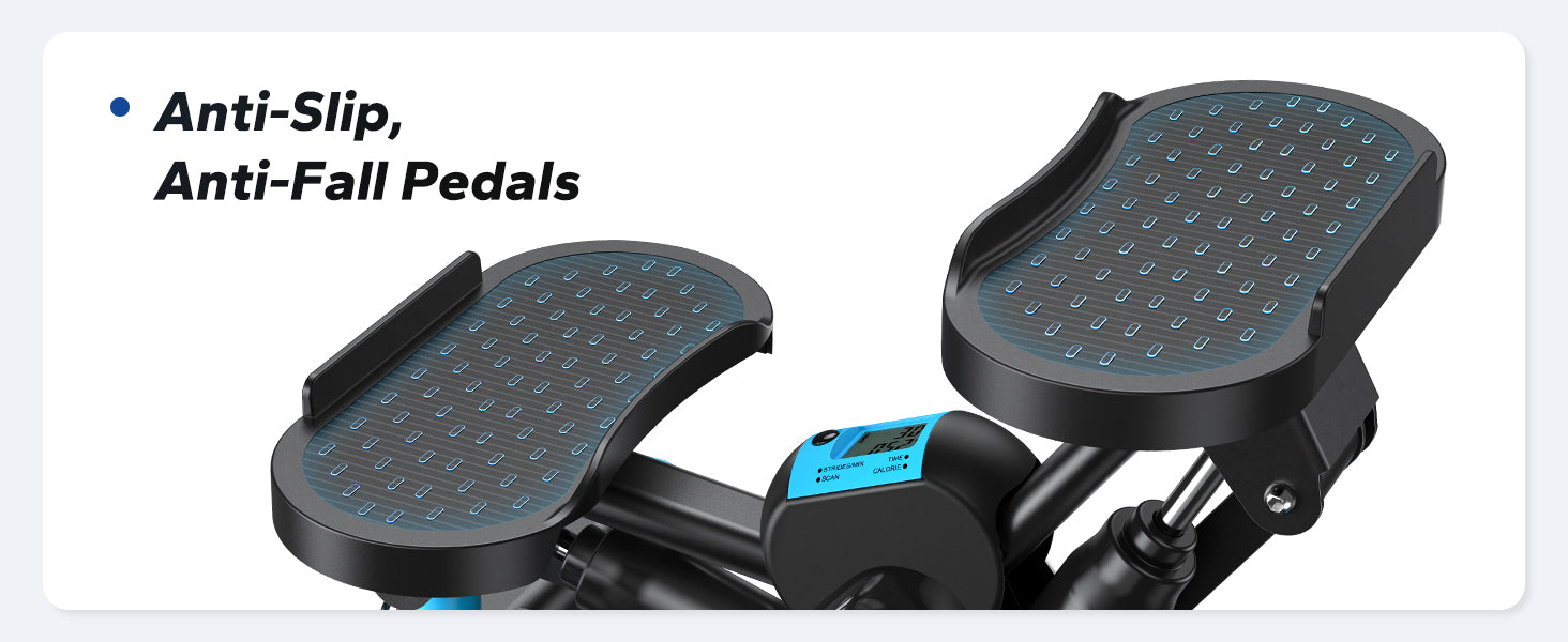 Unlike traditional steppers, our stepper machine features open-ended, oversized pedals without front or rear barriers, making it perfect for users with any foot size. The textured surface ensures secure, slip-resistant footing for safe and comfortable workouts.
