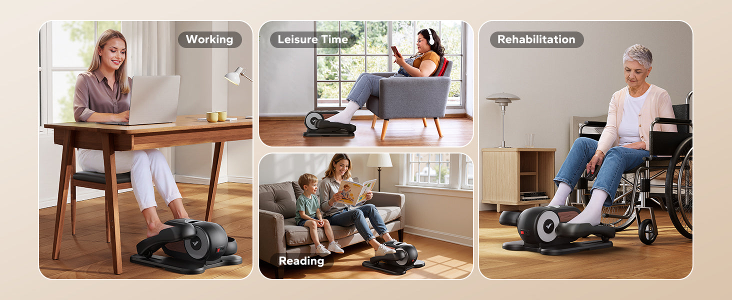 MERACH under desk elliptical machine has Manual (12-level speed) & Auto (P1-P12) for your choice. Pedals can move forward or backward, targeting different muscle groups.Ellipse by legxercise suitable for the whole family.