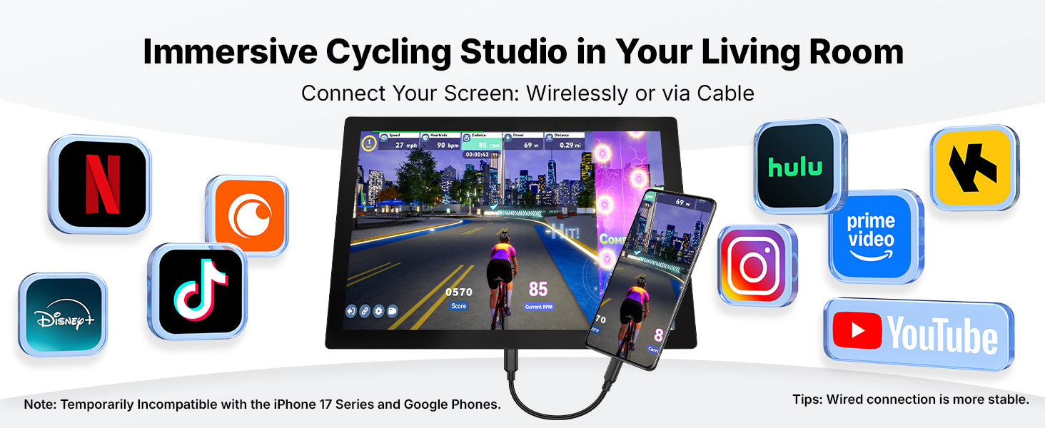 Unlimited Screen Mirroring: Stream workouts, apps, or entertainment from your phone or tablet directly to the bike—whether it’s HIIT, cardio, or your favorite shows, enjoy an immersive and engaging ride.