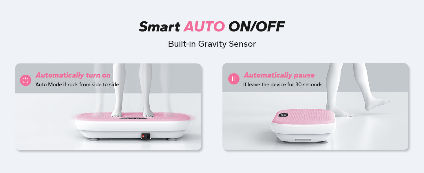 The vibration plate detects user presence with smart sensors it activates automatically when stepped on and pauses after 30 seconds of inactivity for safety. During workouts, it adapts vibration speed based on movement patterns to create personalized sessions.
