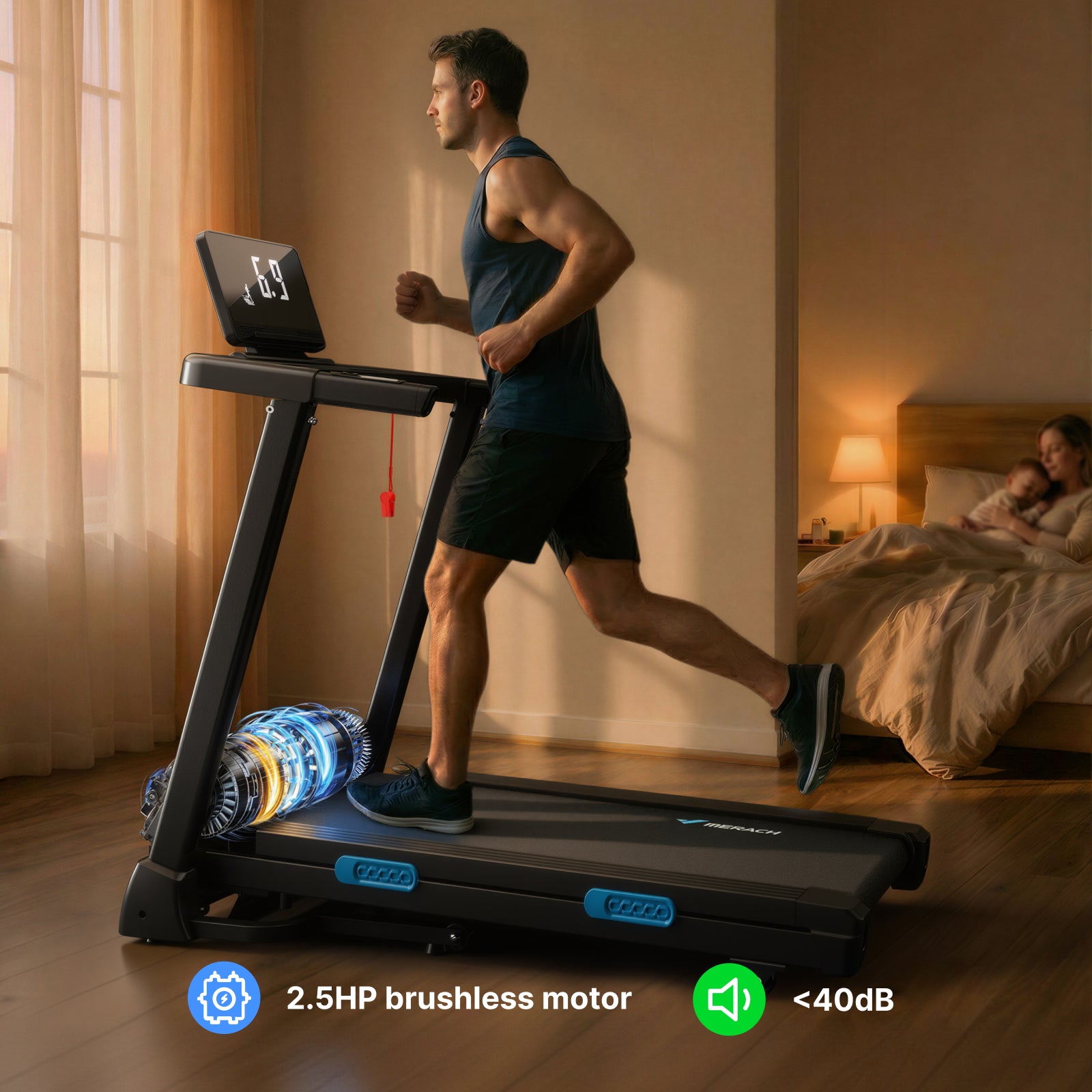 The 2.5HP peak brushless motor ensures smooth performance, supporting speeds up to 7.5 mph for varied workout intensities. An hour of running can burn approximately two burgers’ worth of calories, while the motor operates quietly at under 40 dB, providing a disturbance-free experience.