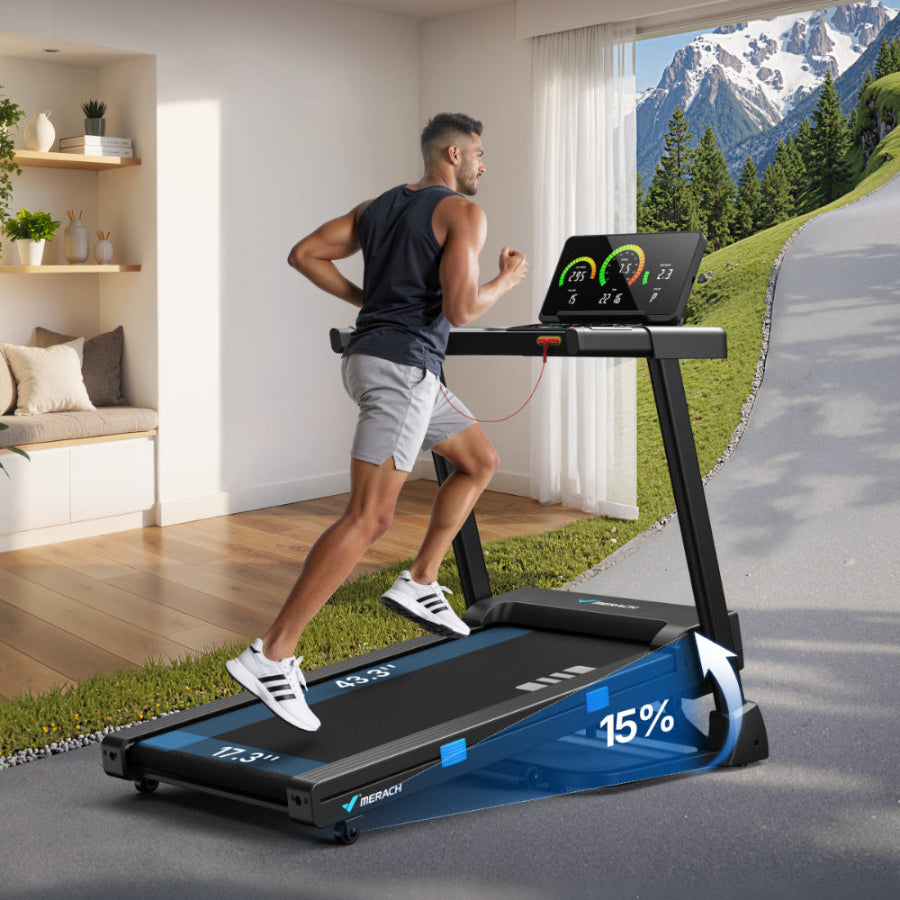 With a 0.5–7.5 MPH speed range, 15 incline levels (0%-15%), and a 43.3" x 17.3" wider belt, this foldable treadmill provides stability and comfort for every stride. The double-deck technology, combined with 4 silicone shock cushions, 6 shock-absorbing pillars, and built-in heart rate sensors, minimizes joint stress while supporting a maximum user weight of 320 lbs.