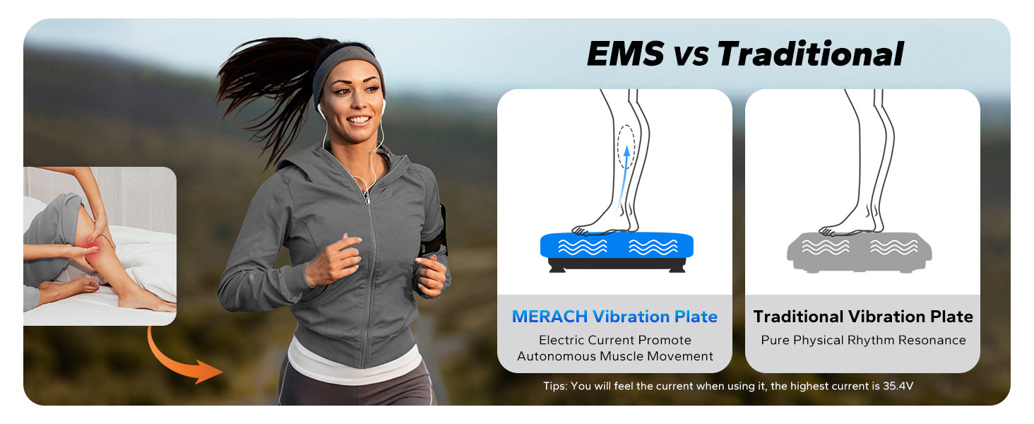 MERACH vibration plate for lymphatic drainage relieves pain in joints, waist, back and legs through low frequency electrotherapy. For athletes, the use of EMS equipment after strenuous exercise helps accelerate the breakdown and absorption of muscle fatigue substances, shortening the time required for the body to recover. Please note: EMS mode must be used barefoot or with bare hands.