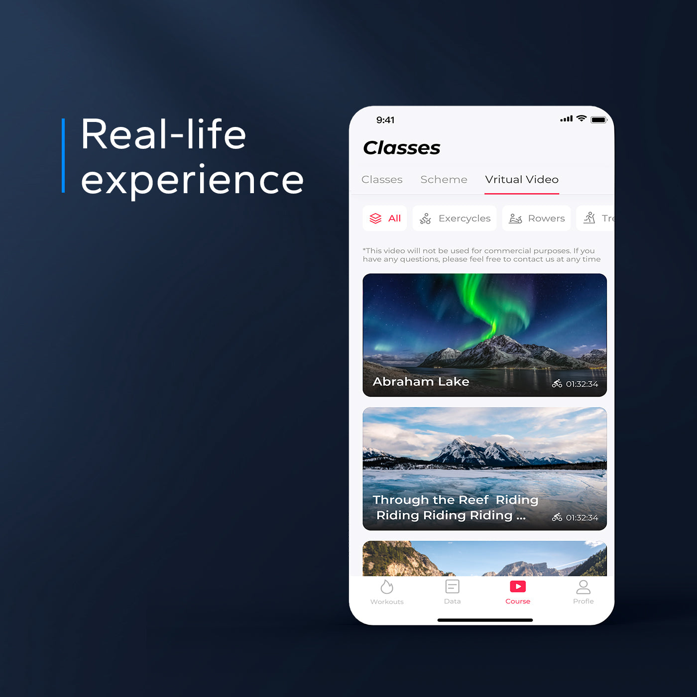 Engage in an immersive treadmill for walking exercises with scenic videos. There are 3 home fitness escapes: Explore, Move, Thrive.